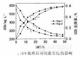 由圖4可知,試驗例1經(jīng)生化處理24h后,COD由起始的596mg/L下降到326mg/L(去除率0.453%);48h后,COD下降到249mg/L(去除率0.582%)。試驗例2經(jīng)生化處理24h后,COD由起始的556mg/L下降到273mg/L(去除率0.508%);48h后,COD下降到229mg/L(去除率0.588%)。綜上所述,由于經(jīng)O3/UV處理后的廢水易被微生物氧化,故在短期內(nèi)即可使COD去除率得以提高(HRT=4.5h時,可提高COD去除率約14%)。隨著生化時間的延長,由于廢水中可生化底物濃度的有限性,使HRT=48h的去除率達到基本一致。