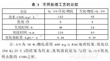 由圖7可知,O3/UV處理45min后,可將物化處理出水的BOD/COD由0.03提高到0.18,有利于達(dá)標(biāo)出水仍能較好地為環(huán)境中的微生物降解。反應(yīng)開始時(shí),由于較大量的O3用于飽和液相,γ值為3.0(較大),45min后γ值為2.7 2.3、O3、O3/UV前置及后置工藝的比較(見表3)