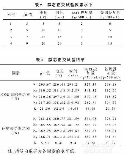 取廢水500mL,采用L16(45)正交表進(jìn)行正交試驗因素、水平參照若干單色配制水處理工藝條件來確定分別是pH值、電解電壓、電解時間、NaCl投加量和內(nèi)電解槽鐵屑投加量等五個因素,每因素取四個水平(見表2),每個試驗重復(fù)一次。?。茫希暮蜕热コ势骄底鳛樵u價指標(biāo)對結(jié)果進(jìn)行分析。試驗結(jié)果如表3。