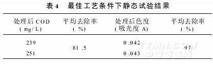 在最佳工藝條件下,以同樣方法對原廢水進行兩次靜態(tài)試驗,結(jié)果如表4。
