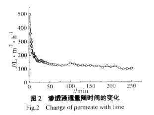 圖2示出陶瓷膜過濾廢水的通量隨時(shí)間的衰減變化,其中跨膜壓差為0.075MPa,錯(cuò)流速度為2.5m·s-1。裝置啟動后通量在開始的20min內(nèi)急劇下降,之后變化幅度逐漸減小,隨著裝置運(yùn)行時(shí)間的增加最終通量穩(wěn)定在100L·m-2·h-1左右。前20min通量的急劇下降是由于廢水中的顆粒物質(zhì)使陶瓷膜產(chǎn)生膜污染,主要為固體懸浮顆粒沉積在膜面形成凝膠極化層、小顆粒部分堵塞膜孔、顆粒在膜表面吸附而形成的[4]。