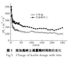 圖5示出了在跨膜壓差為0.275MPa,錯(cuò)流速度為2.5m·s-1的運(yùn)行條件下,在廢水原水中投加0.1g·L-1高嶺土與未投加高嶺土的通量隨時(shí)間的變化。由圖5可知,從裝置開始運(yùn)行投加高嶺土與直接過濾的通量幾乎相等,之后兩者通量都迅速下降,20min后分別降到了250L·m-·2h-1和150L·m-·2h-1左右,裝置運(yùn)行250min后兩者通量分別穩(wěn)定在200L·m-2·h-1和100L·m-·2h-1左右。另外投加高嶺土的廢水的通量要明顯大于直接過濾的廢水通量,分析原因是投加在廢水中的高嶺土?xí)谔沾赡け砻嫘纬梢粚觿?dòng)態(tài)膜,這層高嶺土膜能有效地防止細(xì)小的顆粒進(jìn)入陶瓷膜內(nèi)部堵塞膜孔,從而增大了陶瓷膜過濾廢水的通量。