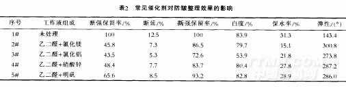 當(dāng)加入上述各種催化劑時(shí).對棉織物的彈性都有顯著的提高,但氯化鋁使棉織物的白度、吸水率、強(qiáng)力產(chǎn)生明顯的下降。2#(氯化鎂)和5#(明礬)作催化劑時(shí),整理效果較好,2#彈性tL5#高.且保水率也較5#低,但2#斷強(qiáng)、斷延、撕強(qiáng)、白度均較5#為低.