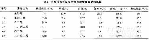 (2)織物的斷強(qiáng)和斷裂延伸度.在加入二醇和甘醇后.織物的斷強(qiáng)和斷裂延伸度都有明顯的提高.其原因可能是交聯(lián)程度降低造成的。