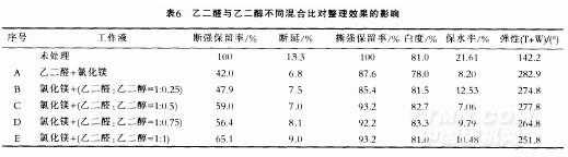 當(dāng)乙二醛:乙二醇:1:0.5時(shí).織物斷強(qiáng)較未加乙二醇時(shí)有顯著增加.因彈性下降較少.彈性較其余比例的都高.乙二醛:乙二醇=1:l時(shí)斷強(qiáng)雖上升最高但彈性下降太多,故選乙二醛:乙二醇:1:0.5比較合理。