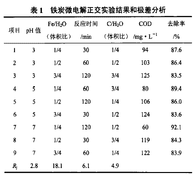 實(shí)驗(yàn)采用正交設(shè)計(jì)法考察pH值、停留時(shí)間、鐵/水比、炭冰比對(duì)廢水COD的去除效果。
