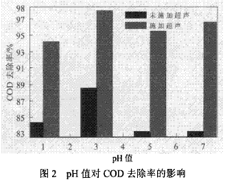 由圖2可以看出,采用超聲協(xié)同鐵炭微電解,對(duì)印染廢水的COD去除效果較單獨(dú)的鐵炭微電解有明顯提高。