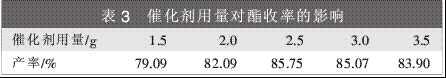 表3結(jié)果表明,催化劑用量對反應(yīng)的產(chǎn)率影響比較大。當催化劑用量達到2.5g時,產(chǎn)率達到最大值。繼續(xù)增加催化劑用量,酯收率反而下降。所以,催化劑的最佳用量為2.5g。