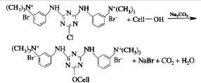 均三嗪基季銨鹽化合物是一類反應(yīng)活性較高的陽(yáng)離子改性劑,按活性基團(tuán)的多少又可分為單活性單季銨鹽、單活性雙季銨鹽和雙活性多季銨鹽.由于反應(yīng)活性高,此類化合物可以使纖維有效地接上陽(yáng)離子,其熱穩(wěn)定性好于環(huán)氧類化合物.雙活性多季銨鹽改性劑可提高其與纖維的結(jié)合力,大大減少試劑用量.但也使大部分試劑與纖維表面的羥基反應(yīng)而未滲透到纖維內(nèi)部,易造成環(huán)染,影響染色布樣的鮮艷度.單活性雙季銨鹽與棉纖維反應(yīng)的方程式如下[2]:
