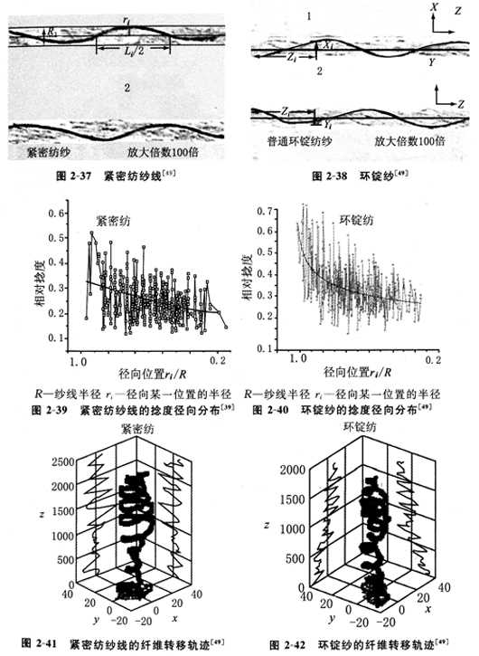 圖2—37和2—38給出了示蹤纖維在緊密紡紗線和環(huán)錠紗中的軌跡。圖2—37中,ri表示示蹤纖維波峰/波谷處的徑向位置;Li/2表示示蹤纖維在徑向位置ri處的半螺距。圖2—38中,X/,yi和Zi表示i點(diǎn)的空間坐標(biāo)位置。圖2—39和2—40給出了緊密紡紗線和環(huán)錠紗的捻度徑向分布。兩種紗線的捻度都是沿著紗線徑向由內(nèi)向外逐漸增大,而且紗線的軸心線都不存在捻度。然而,緊密紡紗線的捻度徑向分布曲線較為平滑,其纖維的內(nèi)外轉(zhuǎn)移程度也低于環(huán)錠紗。