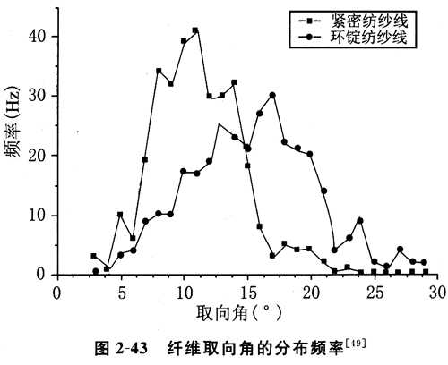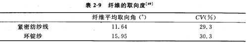 圖2—43和表2—9所示為緊密紡紗線和環(huán)錠紗的纖維取向度。對(duì)于緊密紡紗線,纖維取向角主要分布在7°—14°之間,平均取向角為11.64°。環(huán)錠紗的纖維取向角主要分布在10°~20°之間,平均取向角為15.95°??梢钥闯觯o密紡紗線的取向度明顯高于環(huán)錠紗。