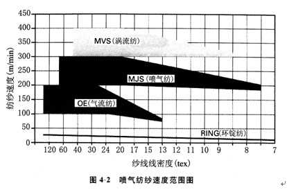 目前,對MJS噴氣紡紗機的綜合評價可概括如下:超大的牽伸倍數(shù)(300倍)、特殊的成紗結(jié)構(gòu)(包纏、包芯、花式)、驚嘆的高速度(如圖4—2所示)、大幅度降低成本(省地省人)、無人化省力化、工序一體化、優(yōu)良的生產(chǎn)環(huán)境及統(tǒng)籌的管理系統(tǒng)。