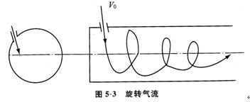 在圓形管道內(nèi)形成渦流的方法有兩種:一是在高壓氣體作用下,氣流沿切線方向射入管道內(nèi),形成螺旋氣流,一邊繞軸心旋轉(zhuǎn),一邊向出口推進(jìn)(噴氣紡紗);第二種方法是用低真空抽引管道中的氣流,使管道內(nèi)形成真空,氣流從管道的進(jìn)風(fēng)口以切線方向進(jìn)入,形成旋轉(zhuǎn)氣流(渦流紡紗),如圖5—3所示。這種旋轉(zhuǎn)氣流的流動(dòng)性質(zhì)近似螺旋線,是一個(gè)旋轉(zhuǎn)渦流場(chǎng),有切向速度、軸向速度和徑向速度。