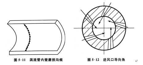 進(jìn)風(fēng)孔中心線與管內(nèi)徑切線設(shè)計(jì)成有一定傾斜的導(dǎo)向角,如圖5—12所示。這樣可使纖維稍稍離開管壁回轉(zhuǎn),減少纖維環(huán)對(duì)管壁的磨損,提高了加捻效率。實(shí)踐表明用20號(hào)鋼內(nèi)層鍍鉻,紡紗時(shí)間5000h,未磨出溝痕,比原來(lái)壽命提高了20倍。
