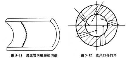進(jìn)風(fēng)孔中心線與管內(nèi)徑切線設(shè)計(jì)成有一定傾斜的導(dǎo)向角,如圖5—12所示。這樣可使纖維稍稍離開管壁回轉(zhuǎn),減少纖維環(huán)對管壁的磨損,提高了加捻效率。實(shí)踐表明用20號鋼內(nèi)層鍍鉻,紡紗時間5000h,未磨出溝痕,比原來壽命提高了20倍。