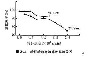 理論上,轉(zhuǎn)杯紗的捻度應(yīng)由轉(zhuǎn)杯速度與引紗速度決定,與假捻盤沒有關(guān)系。但實(shí)際上,轉(zhuǎn)杯紗捻度及加捻效率與假捻盤有直接關(guān)系。追究其原因,是剝離點(diǎn)之后的捻度傳遞長度的影響。落人捻度傳遞長度上的部分纖維最終所獲得的捻回比紗芯捻度少,造成捻度損失,降低了加捻效率。在實(shí)際生產(chǎn)中發(fā)現(xiàn),轉(zhuǎn)杯紡的加捻效率有時(shí)僅60%且與轉(zhuǎn)杯速度有關(guān)。轉(zhuǎn)杯速度越高,加捻效率越低,如圖3—21所示。