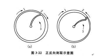 剝離點(diǎn)的運(yùn)動(dòng)速度大于轉(zhuǎn)杯轉(zhuǎn)速,為正向剝?nèi)?,即正常紡紗狀態(tài),稱“正向紡紗”,如圖3—22(a)所示。圖3—22(b)所示為反向剝?nèi)?,即“反向紡紗”,剝離點(diǎn)的運(yùn)動(dòng)速度小于轉(zhuǎn)杯的轉(zhuǎn)速。