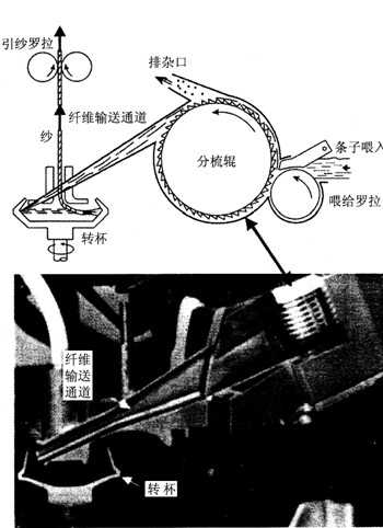 當接頭紗從引紗管吸入杯內時,在離心力作用下被拋向凝聚槽與纖維環(huán)搭接,然后由引紗羅拉引出紗條。紗條隨轉杯回轉而加捻,如圖3—1、3—2所示。纖維不停地喂入、紗條不斷被加捻成紗,再由引紗羅拉輸出,從而實現(xiàn)了連續(xù)紡紗。