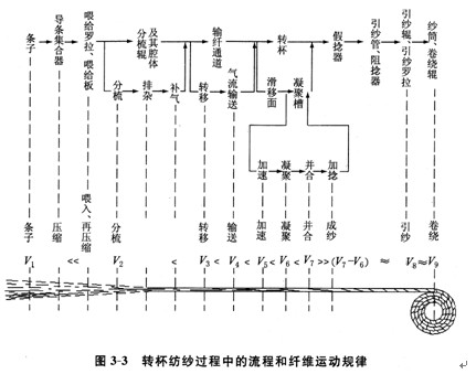 圖3—3表示轉杯紡紗工藝流程和纖維運動規(guī)律。從圖3—3中可初略估算紡紗流程中的纖維運動規(guī)律。實際生