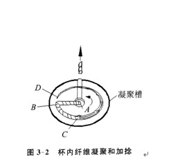 在須條從B點剛被剝離的位置,纖維數(shù)量應為零(空白區(qū))。但實際上,轉杯在不斷回轉,纖維不斷向下輸送和向下滑移,因此這一空白區(qū)會被新下滑的纖維覆蓋。在紗尾D和“捻度傳遞長度”BC段堆積的纖維,稱“搭橋纖維”。須條剝離、加捻、引出時,搭橋纖維就成為纏繞在紗體外表的纏繞纖維。