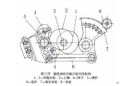 如圖2-28所示為撓性劍桿共軛凸輪引緯機構(gòu)。共軛凸輪1、2固定在主軸3上,當主軸3回轉(zhuǎn)時,共軛凸輪1、2隨之回轉(zhuǎn),通過兩個轉(zhuǎn)子4推動擺桿5,帶動連桿6作往復運動,扇形齒輪7隨之擺動,使齒輪8往復回