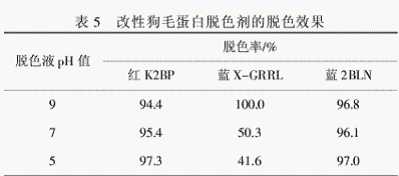 由圖5可知,當pH值超過4時,脫色率有所下降,原因是:溶液的酸性較強時,蛋白質(zhì)水解顯著,分子質(zhì)量降低,溶解度增大,對染料的吸附沉降能力降低,很難起到脫色作用;當pH在4左右時,改性狗毛蛋白帶有一定量正電荷并處于等電點附近,蛋白質(zhì)大分子發(fā)生了較少的降解,蛋白質(zhì)溶解度小,脫色效果較為理想.綜合考慮,脫色液pH值選擇4左右,此時脫色率為97.4%.