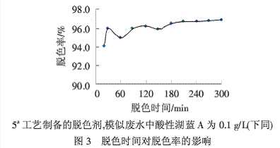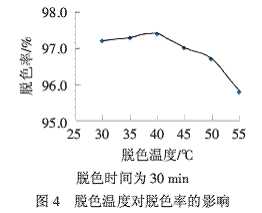 從圖3可以看出,30 min時,脫色較為充分,脫色率達到較佳值,之后,隨著脫色時間的延長,脫色率變化不大.為了省時、節(jié)能,選取30 min為其最佳的脫色時間,此時脫色率可達到96.0%