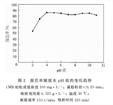 一般認(rèn)為,pH值既能影響吸附劑的表面結(jié)合位點(diǎn),又能影響染料分子表面的電離-聚集過程,因此本研究將其作為首要的優(yōu)化因素。由圖2可見,在設(shè)定的pH值范圍內(nèi),當(dāng)廢水pH值由2升至4時(shí),滸苔對廢水的脫色率顯著提高;pH值為4~11時(shí),脫色率保持在較高水平(82.32%以上),且波動(dòng)幅度不大。Cengiz[5]利用總狀蕨藻(Caulerparacemosavar.cylindracea)吸附吸附MB的研究中也得到類似結(jié)果:隨著pH值由3增至7,脫色率隨之增加,繼續(xù)增大pH值,脫色率保持穩(wěn)定。這可能與藻粉表面性質(zhì)因pH值而改變有關(guān)。在低pH值時(shí),藻粉表面因質(zhì)子化而帶正電荷,與MB陽離子產(chǎn)生排斥作用,使吸附量較低。在pH值較高時(shí),藻類細(xì)胞壁表面帶負(fù)電荷,對帶正電荷的MB靜電引力增大[7]。由于模擬廢水初始pH值(4.7)處于最優(yōu)吸附的pH值區(qū)間(4~11),故以下研究中模擬廢水的初始pH值均采用4.7。