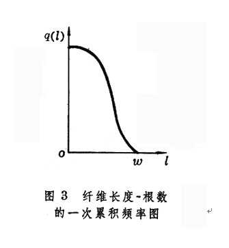 纖維按長度排列時表達其累計根數(shù)和長度的坐標(biāo)圖,如用拜氏纖維長度分析器反方向排圖并轉(zhuǎn)動90°時,即得到相近于纖維長度的一次累積頻率圖。以橫軸表示纖維長度,縱軸表示某一長度纖維的累計根數(shù)百分率q(□),即得纖維長度-根數(shù)的一次累積頻率圖(圖3纖維長度-根數(shù)的一次累積頻率圖), q(□)曲線為一次累積頻率曲線,□表示纖維的總長度,纖維的根數(shù)平均長度為□,由于q(o)=1,故□代表纖維的根數(shù)平均長度。