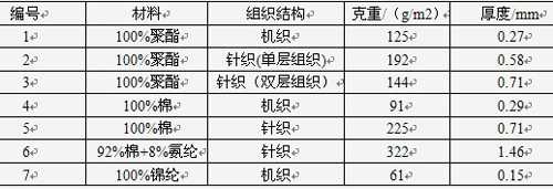 本試驗選取幾種具有代表性的織物,規(guī)格如表1所示。
