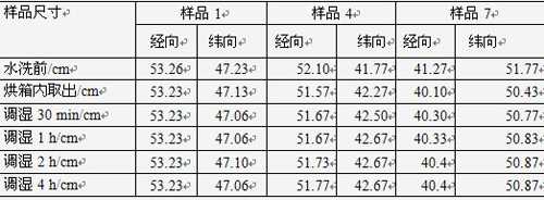 4) 比較以上結果可知:織物水洗尺寸變化率跟織物的成份有很大關系,滌綸織物干燥后達到尺寸穩(wěn)定所需平衡時間最短,而加有氨綸的棉針織物所需平衡時間最長。