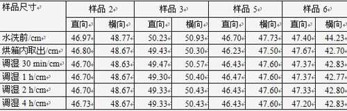 將烘干后的樣品放置在溫度(20±2)℃,相對濕度(65±4)%的標準大氣條件下平衡,分別測試樣品從烘箱內剛取出時的尺寸以及在不同平衡時間下的尺寸(每個樣品測試3次,取平均值)樣品測試結果見表2和表3所示。