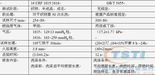 美國(guó) 16 CRF 1615(0~6歲)/1616(7~14歲)《 兒童睡衣的可燃性標(biāo)準(zhǔn)》;我國(guó)GB/T5455 阻燃機(jī)織物、針織物、涂層產(chǎn)品、層壓產(chǎn)品的測(cè)試原理:將一定尺寸的試樣置于規(guī)定的試樣架上進(jìn)行干燥和冷卻后,置于規(guī)定的燃燒器下,用標(biāo)準(zhǔn)火焰點(diǎn)燃試樣規(guī)定的時(shí)間,同時(shí)記錄其續(xù)燃時(shí)間、陰燃時(shí)間并測(cè)量其損毀長(zhǎng)度。 差異見(jiàn)詳見(jiàn)表2。
