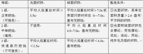 美國(guó)CPSC 16 CFR1610聯(lián)邦技術(shù)性法規(guī)《服用紡織品的燃燒性標(biāo)準(zhǔn)》將燃燒性分為1級(jí)(正常燃燒可接受)、2級(jí)(中等易燃燒 慎用)、3級(jí)(快速劇烈燃燒 不可接受即不適合用于制衣)。