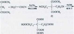 棉、麻、絲織物及粘膠纖維在紡織印染過程中易產(chǎn)生劇烈的收縮,自身又缺少彈性,防皺性較差.為克服以上缺點,需對上述纖維進行化學(xué)防皺整理.隨著國內(nèi)外對綠色環(huán)保的日益重視,開發(fā)無甲醛整理劑代替?zhèn)鹘y(tǒng)的N一羥甲基酰胺類整理劑已成為必然的發(fā)展趨勢.[1-31近年來,國內(nèi)外對棉織物的低甲醛或無甲醛化學(xué)抗皺整理的研究非常多,其中多元羧酸1,2,3,4一四羧酸丁烷(BTCA)是一種性能優(yōu)良的無甲醛抗皺整理劑,但成本過高,很多印染廠無法承擔(dān)4引]活潑亞甲基化合物的邁克爾加成反應(yīng)是有機合成中制備多羰基化合物的一類重要反應(yīng),對其反應(yīng)體系的研究一直受到廣泛的重視[8-121本文以丙二酸二甲酯和丙烯腈為主要原料,利用活潑亞甲基化合物的邁克爾反應(yīng),以PEG2000為相轉(zhuǎn)移催化劑,無水碳酸鉀為堿劑,正己烷為溶劑,合成得到了目標(biāo)產(chǎn)物DEMN(4,4一二甲酸基一1,7一庚二酸).并將DEMN應(yīng)用于棉織物的抗皺整理,通過折皺回復(fù)性能、白度及強力保留率(BSR)表征該無甲醛整理劑的抗皺效果.合成過程如下: