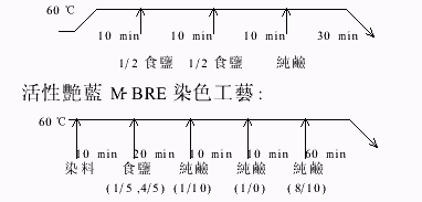 配方:染料1%(o.w.f),浴比1︰25,食鹽30g L,用活性艷紅X 3B和活性艷藍(lán)KN R染色時純堿用量為10g L,用活性艷藍(lán)M BRE染色時則為20g L。活性艷紅X 3B和活性艷藍(lán)KN R的染色工藝:
