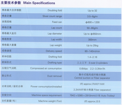 BS368型條并卷機是高效的精梳準備設(shè)備,操作簡單,自動化程度高,棉條合并數(shù)、牽伸倍數(shù)分配合理。采用兩區(qū)牽伸對預(yù)并后的棉條進一步并合牽伸,提高纖維的平行度及伸直度,經(jīng)過排列為S型的四根壓輥軋光和可調(diào)的棉卷加壓裝置,保證了在兩個成卷羅拉上形成的棉卷,具有最佳的纖維分布和最優(yōu)的均勻結(jié)構(gòu)。采用新型運棉小車,進一步保證了棉卷在轉(zhuǎn)運和精梳機上卷過程中良好的分層結(jié)構(gòu)和可靠的退卷,提高了生產(chǎn)效率。條并卷機與精梳機用小車和導(dǎo)軌配合,形成一套合理、高效的精梳系統(tǒng)。