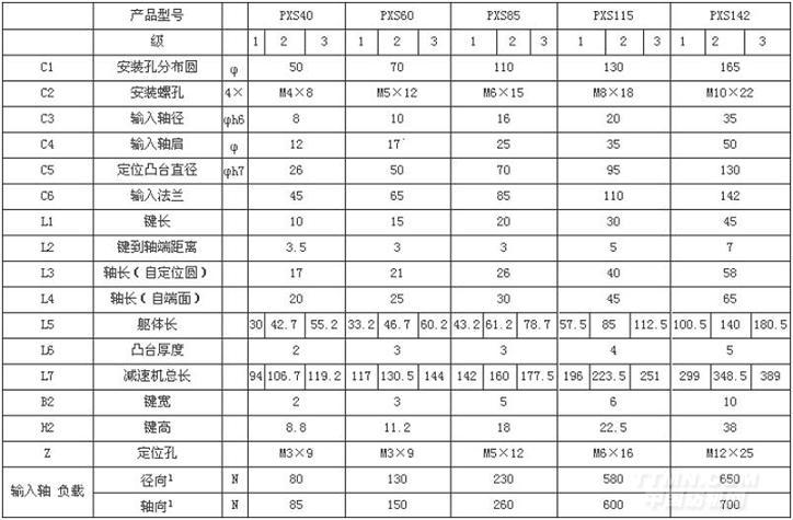 角標(biāo)“”在輸入轉(zhuǎn)速3000rpm時(shí),使用壽命作用于輸入軸中心位置(L/2處)之容許徑向力及軸向力備注:PXS系列除轉(zhuǎn)動(dòng)慣量與系列不同外,其余參數(shù)均可參考對(duì)應(yīng)的系列