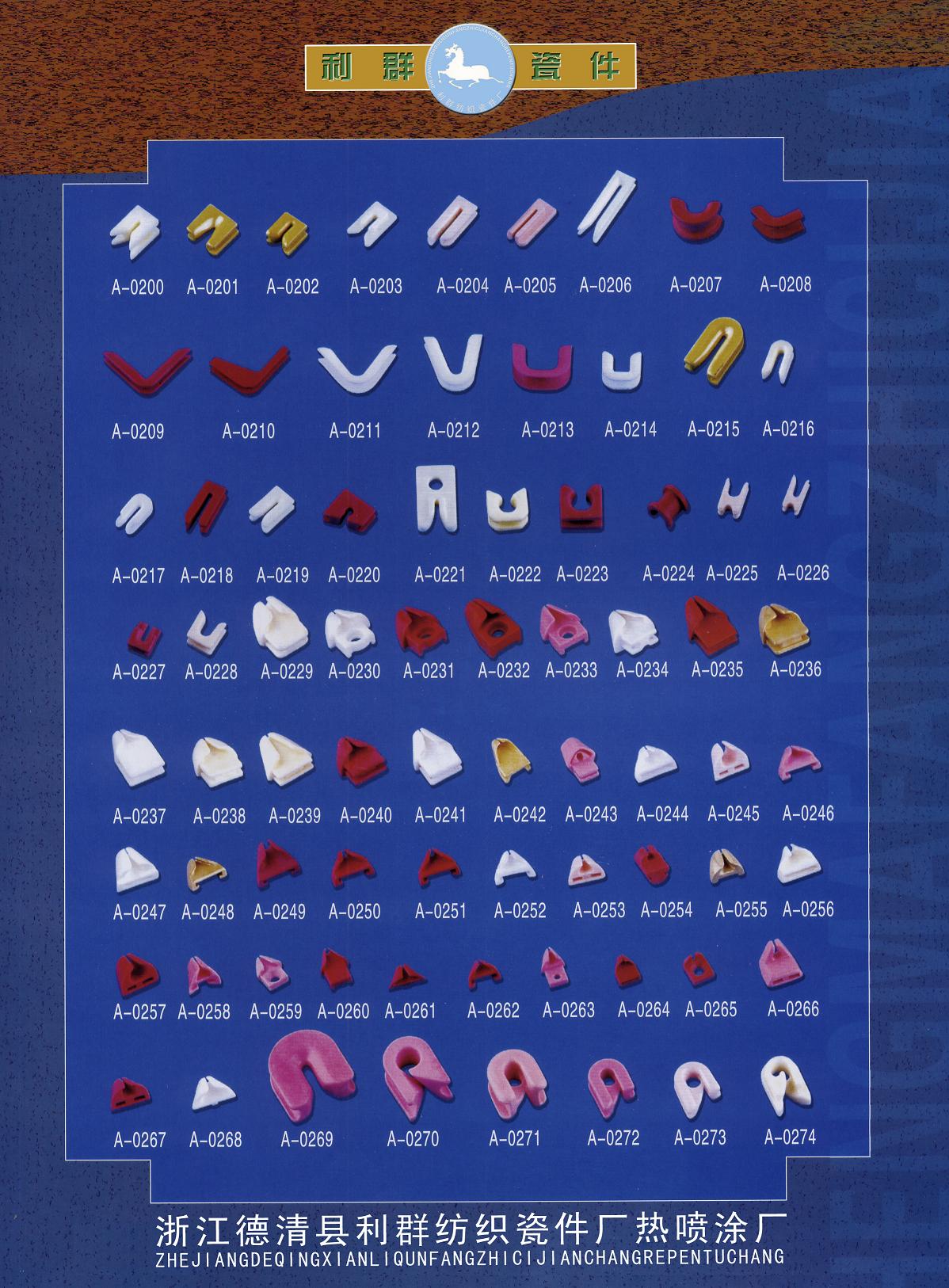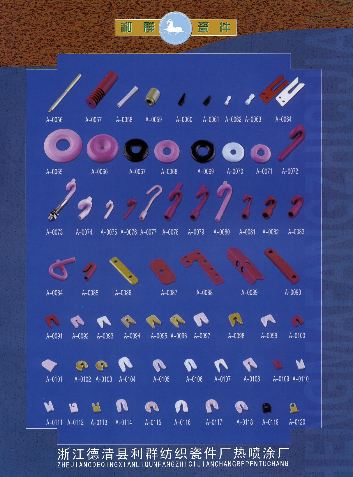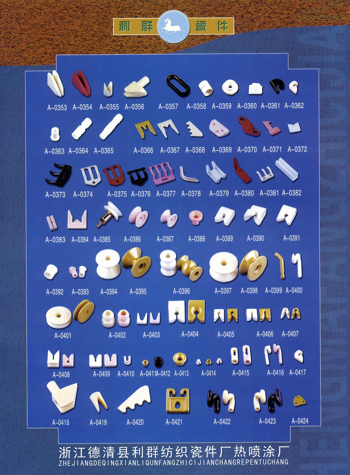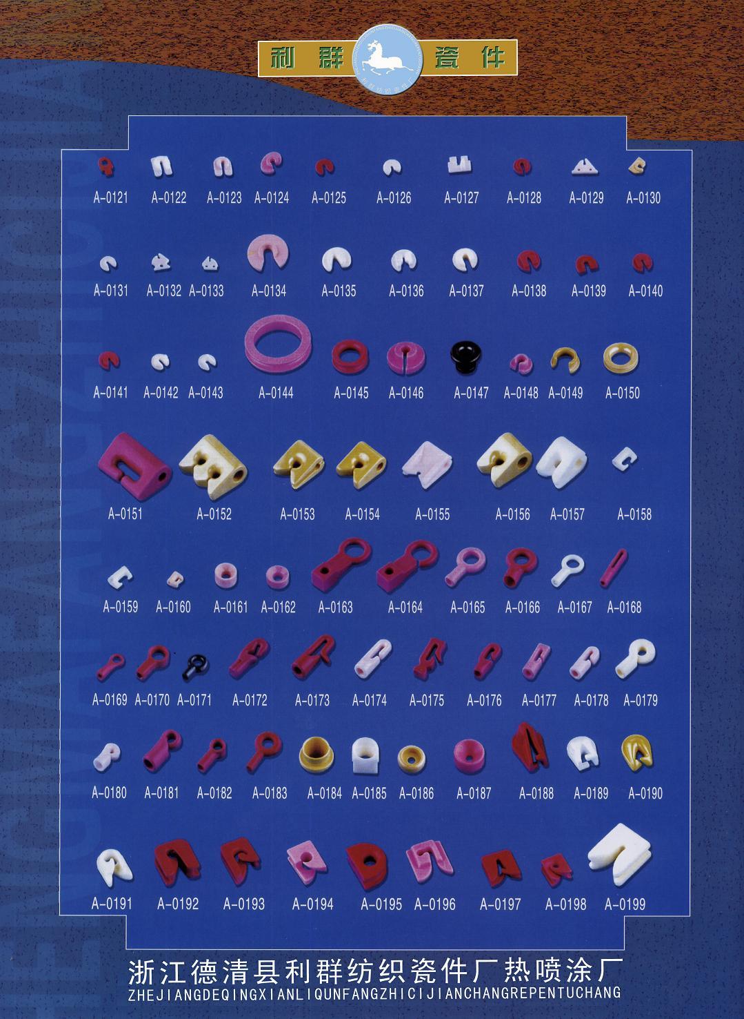 浙江省德清縣利群紡織瓷件廠是普瓷、九五瓷、九九瓷、鈦瓷的專業(yè)生產公司。適用于各種細紗機、氣流紡紗機、倍捻機、絡筒機、并紗機、捻線機、劍桿織機、噴氣織機、噴水織機、勾編織機、各式整經機、大圓機、織襪機、包覆機、加彈機、卷繞頭、紡絲機、電腦繡花機、商標機、繞線機、電子清紗器、電子切絲器、電子感絲器、電子儲緯器及其他機械導絲器。來樣可定做,歡迎來電垂詢。