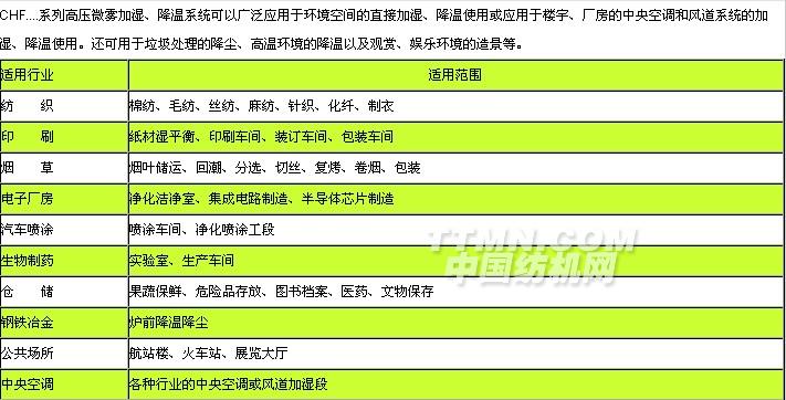 CHF....系列高壓微霧加濕、降溫系統(tǒng)包括主機(jī)、輸水管路和高壓霧化噴嘴等,主機(jī)分為五種型號(hào):