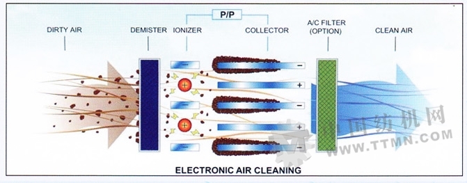 采用高頻、高壓靜電原理,主要是利用陰極在高壓電場中發(fā)射出來的電子,以及由電子碰撞空氣分子而產(chǎn)生的負(fù)離子來捕捉油煙油霧粒子,使粒子帶電,再利用電場作用使帶電粒子被陽極所吸附,以迭到凈化目的。