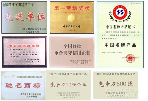 1992年以來(lái),企業(yè)被列入"中國(guó)500家最大機(jī)械工業(yè)企業(yè)"、"國(guó)家機(jī)電產(chǎn)品出口基地企業(yè)"、"外貿(mào)自營(yíng)進(jìn)出口企業(yè)",連續(xù)12年在全國(guó)紡機(jī)行業(yè)綜合經(jīng)濟(jì)指標(biāo)評(píng)比中名列前十強(qiáng)。先后被授予"全國(guó)五一勞動(dòng)獎(jiǎng)狀先進(jìn)集體"、"全國(guó)精神文明建設(shè)先進(jìn)單位"、"浙江省最佳經(jīng)濟(jì)效益工業(yè)企業(yè)"、"浙江省技術(shù)進(jìn)步優(yōu)秀企業(yè)"、董事長(zhǎng)傅國(guó)定同志于1988年起先后被中華全國(guó)總工會(huì)、國(guó)務(wù)院授予"全國(guó)優(yōu)秀經(jīng)營(yíng)管理者"、"五一勞動(dòng)獎(jiǎng)?wù)?quot;和"全國(guó)勞動(dòng)模范"。于2001年被國(guó)家工商行政管理總局評(píng)為 “全國(guó)首批重合同守信用企業(yè)”。2005年9月,“金鷹”牌桑蠶絹絲,2007年9月“金鷹”牌亞麻紗被國(guó)家質(zhì)檢總局評(píng)為"中國(guó)名牌"產(chǎn)品。2008年1月,“金鷹”商標(biāo)被國(guó)家工商行政管理總局商標(biāo)局認(rèn)定為中國(guó)“馳名商標(biāo)”,2008年7月,公司榮獲中國(guó)麻紡行業(yè)競(jìng)爭(zhēng)力10強(qiáng)和中國(guó)紡織服裝企業(yè)競(jìng)爭(zhēng)力500強(qiáng)稱號(hào)。