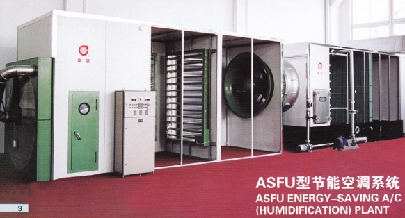 ASFU型節(jié)能空調(diào)系統(tǒng)以專利產(chǎn)品噴霧軸流通風(fēng)機為核心設(shè)備,并對空調(diào)構(gòu)件如檔水板、調(diào)節(jié)窗、水泵、噴排、噴淋室結(jié)構(gòu)及送風(fēng)系統(tǒng)均作了改進(jìn)和優(yōu)選。從理論上和系統(tǒng)設(shè)計上改變了原傳統(tǒng)噴淋空調(diào)風(fēng)機避風(fēng)、噴淋處理空氣的老模式,實現(xiàn)了取消噴淋水泵或減少水泵容量及開啟時間。達(dá)到空調(diào)節(jié)水、節(jié)電的目的。是紡織空調(diào)技術(shù)和結(jié)構(gòu)的重大創(chuàng)新,成為紡織空調(diào)的更新?lián)Q代產(chǎn)品。