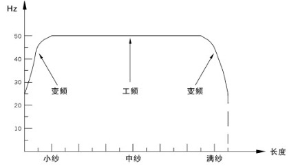 在小紗與大紗時(shí),主電機(jī)由變頻驅(qū)動(dòng),中紗時(shí)由工頻驅(qū)動(dòng)??捎行Ы档凸模娱L(zhǎng)變頻器使用壽命。