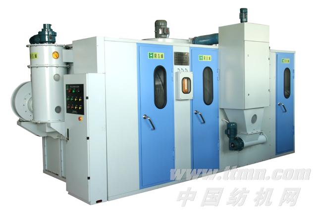 一、 產(chǎn)品用途:該機可用于棉、麻、毛、化纖等行業(yè)的空調(diào)濾塵系統(tǒng),過濾和收集空氣中的纖維粉塵,以達到凈化空氣的目的二、 結(jié)構(gòu)特點:1、 占地面積小,在處理風量較大時,占地面積可比其它濾塵設(shè)備減少約為15%.2、 采用不銹鋼絲風和長毛絨二級過濾,纖維與短絨和粉塵分別回收,提高纖維的利用率。3、 濾筒部件由多個直徑大小不同的錐形筒體及插片式濾料網(wǎng)板組成,結(jié)構(gòu)簡單新穎,更換濾料方便、快捷。4、 采用長毛絨濾料,阻力小,過濾效率高,阻燃5、 濾料由網(wǎng)板支承,不會鼓起,保證集塵吸嘴貼附于小料,吸塵可靠,效果好。6、 吸嘴部件由多個可調(diào)吸嘴和吸塵管組成,每個濾筒內(nèi)采脾雙吸嘴吸塵,從而縮短了吸臂往復運動的行程,清潔速度快。7、 二級傳動機構(gòu)只由一臺減速機傳動,采用皮帶傳動方式,通過簡單實用的往復絲杠巧妙地將單一的加轉(zhuǎn)運動抽象成旋轉(zhuǎn)加往復的復合運動。從而滿足吸嘴的動作要求。整個傳動機構(gòu)及控制電路簡單可靠,故障率低。三、 結(jié)構(gòu)及工作原理:1、 多筒式除塵機組是由第一級圓盤預過濾器和第二級多筒式濾塵器構(gòu)成的機電一體化的除塵機組。第一級圓盤預過濾器主要過濾、分離、收集被處理空氣中的纖維和雜質(zhì)。第二級多筒式濾塵器主要過濾:分離、收集第一級過濾后空氣中的微細纖塵和粉塵。2、 工作時,本機在塵室內(nèi)與主風機放在一起,在主風機抽吸作用下,塵室外呈負壓狀態(tài),含塵氣流從入口進入本機,首先通過一級圓盤濾網(wǎng),纖維和雜質(zhì)被阻留在濾網(wǎng)上,旋轉(zhuǎn)吸嘴利用排塵風機的風力,將纖維和雜質(zhì)吸除,通過纖維壓緊器分離,壓緊排出,分離后的含塵空氣返回一級箱體內(nèi),細小粉塵進入二級多筒式濾塵器,被吸附到濾料內(nèi)表面,由旋轉(zhuǎn)吸嘴吸入布袋集塵器進行塵氣分離,采用新型機械震蕩裝置定時落灰,粉塵通過粉塵壓實器,壓緊排出。分離出的含塵空氣透過集塵布袋排回二組級箱體。經(jīng)過過濾的潔凈空氣透過濾筒排到機外。本機組也可正壓運行。
