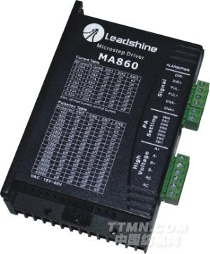 MA860驅(qū)動(dòng)器,主要驅(qū)動(dòng)57、86型兩相混合式步進(jìn)電機(jī)。其微步細(xì)分?jǐn)?shù)有16種,最大步數(shù)為51200Pulse/rev;其工作峰值電流范圍為2.4A-7.2A,輸出電流共有8檔,電流的分辨率約為0.6A;具有自動(dòng)半流,過(guò)壓、過(guò)流保護(hù)等功能。本驅(qū)動(dòng)器為交直流供電,建議工作電壓范圍為18VAC-50VAC,電壓不超過(guò)50VAC,不低于16VAC。