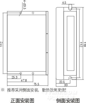驅(qū)動器的外形尺寸為:151×97×48mm,安裝孔距為143mm。既可以臥式和立式安裝,建議采用立式安裝。安裝時,應(yīng)使其緊貼在金屬機(jī)柜上以利于散熱。