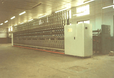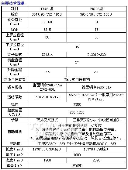 本機外形簡潔、墻板跨距小、剛性好、結(jié)構(gòu)穩(wěn)定。主電機安排在車尾,檢修及變換速度方便。錠子傳動采用滾盤及滾動軸承、雙張力盤,適合高速運轉(zhuǎn)及捻向變換。車頭傳動采用雙面捻度及適應S.Z捻的傳動機構(gòu)。FB721采用雙排交叉、臥式筒子架,F(xiàn)B722采用三排交叉臥式筒子架,上下左右交叉排列。斷頭自停裝置采用插片式。錠子采用油膜阻尼吸震錠子,對速度適應性廣,振動小。鋼令板,導紗板,氣圈環(huán)都采用牽吊式升降。升降系統(tǒng)自動化程度較高,操作簡便。通過輸送帶可將使用過的空筒管輸送到車尾。