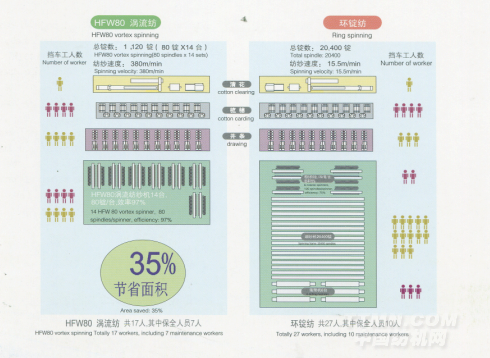 新型渦流紡能耗加上空氣壓縮機(jī)能耗,單與細(xì)紗機(jī)比較,前者能耗大,但加上粗紗機(jī)和落筒機(jī)還有空調(diào)的能耗,渦流紡與其相比減少了20%。