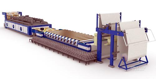 設(shè)備流程:平幅進布 →刷毛吸塵裝置→紅外線對邊裝置 → 貼布→ 磁棒印花(8套色) → 烘房烘燥(3室容布量約33M)→ 平幅落布(帶靜電消除器)